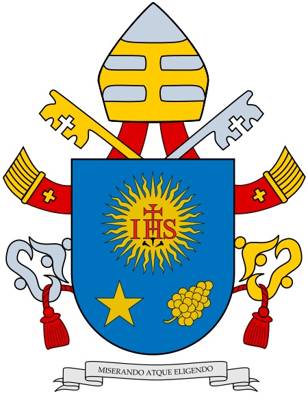 Das Papstwappen wurde am 18. März 2013 bekanntgegeben. Es zeigt dieselben Motive wie das Kardinalswappen, allerdings unter der Mitra, die, mit den gekreuzten Schlüsseln Petri, exakt vom Wappen Benedikt XVI. übernommen wurde. Das Kennzeichen der Jesuiten, eine österliche Sonne, vor der das von Bernhardin von Siena popularisierte griech. Christusmonogramm IHS (lat. als Iesus Hominum Salvator interpretiert) zu sehen ist, der Buchstabe "H" von einem Kreuz überragt, darunter die drei Kreuznägel, vergegenwärtigt das mysterium paschale. Hinzutreten ein goldener Stern als marianisches Symbol (stella maris, stella matutina) und, den Hl. Joseph repräsentierend, eine Nardenblüte. Das zentrale Sonnenmotiv, Christus als sol invictus weckt zugleich Assoziationen an die Sonne in der Flagge Argentiniens, kann aber auch franziskanisch gedeutet werden. Dante schrieb sinngemäß über Franz von Assisi: Er ist aufgegangen über uns wie die Sonne. [1] Devise zum Wappen ist das Motto des Erzbischofs: miserando atque eligendo, entnommen aus einer Predigt des Beda Venerabilis (Homilie 21); die schlagwortartige Übersetzung "Aus Barmherzigkeit erwählt" ist grammatikalisch nicht ganz korrekt. In der Originalstelle geht es darum, dass Jesu Blick, der auf den Zöllner Matthäus fällt, erbarmend und auch erwählend zugleich war, ihn in Erbarmung und auch Erwählung ansehend. Die Zeichnung des Wappens wurde am 26. März noch korrigiert: Der Stern soll - marianisch - achtzackig abgebildet werden, die Nardenblüte wurde naturalistischer gestaltet.