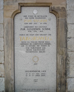 Hofer Bürger, die von einer Pilgerfahrt nach Santiago zurückgekehrt waren, stifteten im Jahr 1487 in der Hofer St.-Michaelis-Kirche einen Altar zu Ehren des Heiligen Jakobus. An ihm sollte regelmäßig eine Messe gefeiert werden. Von den Stiftungsgeldern wurde außerdem bei der St. Niclaskirche in der Altstadt der Umbau eines Hauses zu einem Pilgerhospiz finanziert. An der Herberge brachte man ein Schild mit der Abbildung eines Pilgers an. Die Unterkunft erhielt den Namen Gasthof zum Pilgrim. Pilger, die eine entsprechende Beglaubigung, den Pilgerpass besaßen, konnten hier kostenlos übernachten und einfache Mahlzeiten erhalten. Gegen Ende des 18. Jahrhundert erhielt das Gebäude einen neuen Namen: Gasthof zur goldenen Sonne. An ihn erinnert heute der Sonnenplatz, ein Platz westlich vor der Marienkirche.