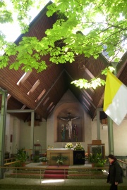 Nördlich der Kirche schließt sich der 1966 erbaute überdachte Altarraum an. Darin befindet sich eine überlebensgroße Darstellung der Kreuzigung Christi mit Maria und Johannes aus der Zeit um 1500. Diese Darstellung war ehemalsKünstler in Eltville. Der Pilgerplatz bietet für 2000 Wallfahrer Raum. Altar, Ambo und Kanzel sind durch Bronzeplastiken des Künstlers Arnold Morkramer geschmückt. Die Plastik am Hochaltar ist Joh. 15,1-2 entnommen: „Ich bin der wahre Weinstock....“; die Darstellung am Ambo ist Joh. 15,6 entnommen: „Wer nicht in mir bleibt...“, und die zwei Darstellungen an der Kanzel sind ebenfalls dem Evangelium Johannes entnommen, nämlich 15,9 „Wie mich der Vater geliebt“ und „Bleibt in meiner Liebe“.
