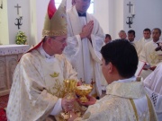 Der Bischof überreicht eine Patene mit einer ungewandelten Hostie und dem Kelch dem Weihekandidaten bei der Priesterweihe. Er überträgt damit die Gewalt (übernatürliche Fähigkeit), das Messopfer darzubringen.[2]