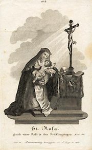 Die Heilige Rosa von Lima, Isabel de Flores de Oliva, 'Südamerikas erste Blüte der Heiligkeit' (* 20. April 1586 in Lima, Peru; † 24. August 1617 Lima), ist eine Jungfrau, Mystikerin und Terziarin des Dominikanerordens.